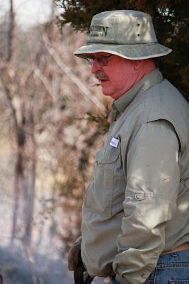 Poor Papa Kenny was headin' up the front line of the fire line. Armed with a shovel, he was mighty. There came a point in time when the fire was trying to get the best of him, crossing over the fence line into the highway. He fought a hard fight. He beat that fire like it was a red headed step child. Big Man came in though with his old blue tractor, and with one swipe of the bucket, he showed that fire who was boss. Look at his expression on the tractor..."What the heck is he doing with that shovel? Let me be the Big Man I am and show him what a big boy toy can do." Ha ha! Kenny would have taken the big boy toy over the shovel...any day.